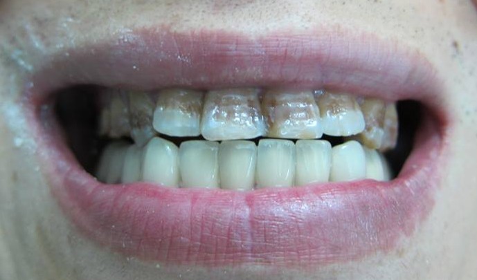 Teeth can be discoloured because of excessive consumption of coloured foods (liquorice) and beverages (coffee, tea, coke, red wine), poor oral hygiene, cigarette smoking.