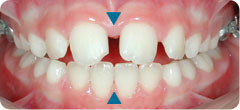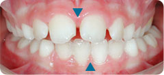 After palatal expansion, the mandible is centred and the upper and lower midlines are aligned (see blue triangles). The mandible can now grow normally.